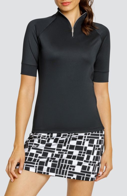 - Quarter-zip short sleeve golf top with funnel neck and inserts.