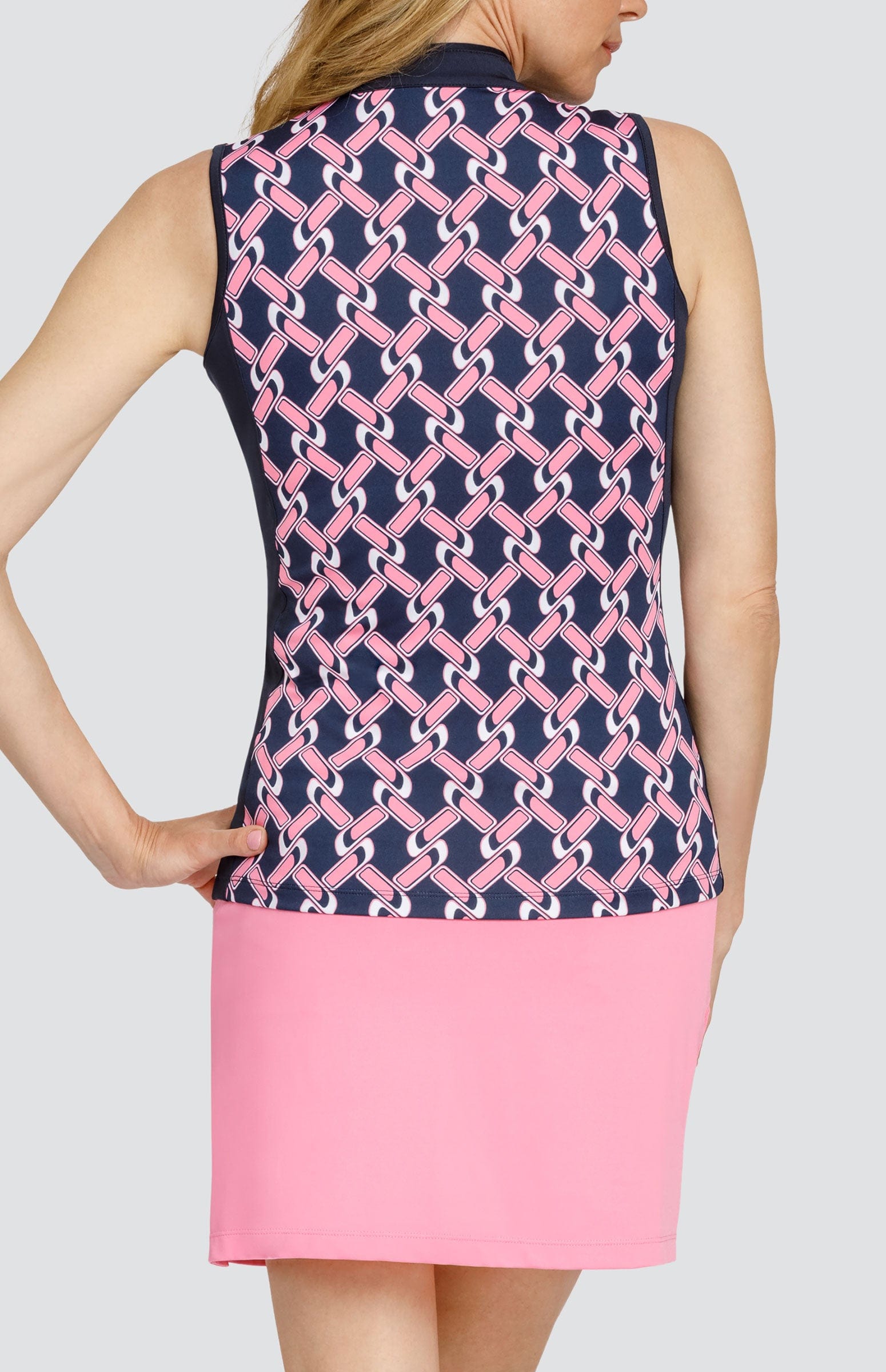 From our Kismet Empress collection. The striking Night Navy side inserts and mandarin collar on this quarter-zip sleeveless Darly Top bring the Geo Twist print to new heights. Our moisture-wicking Performance Jersey with built-in UPF 50+ protection will keep you cool, dry, and comfortable without needing to worry about the sun’s harmful rays.