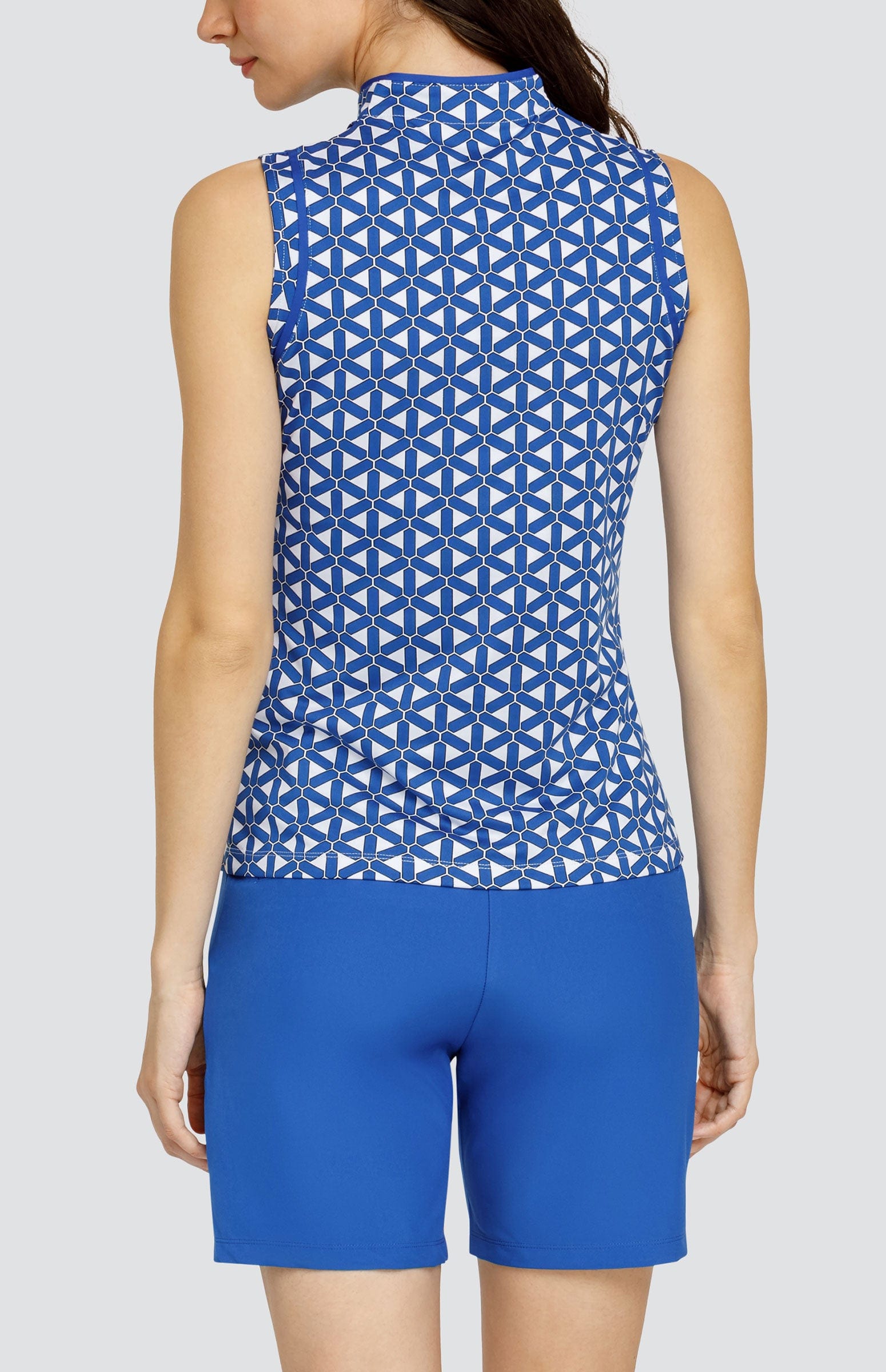 - Quarter-zip sleeveless golf top with mandarin funnel neck, piping, and vents