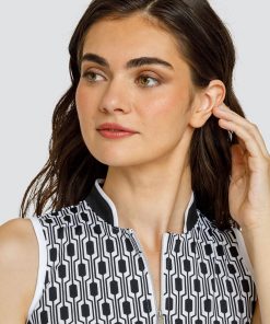 - Quarter-zip sleeveless golf top with novelty collar and inserts.