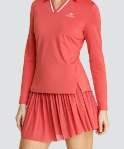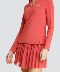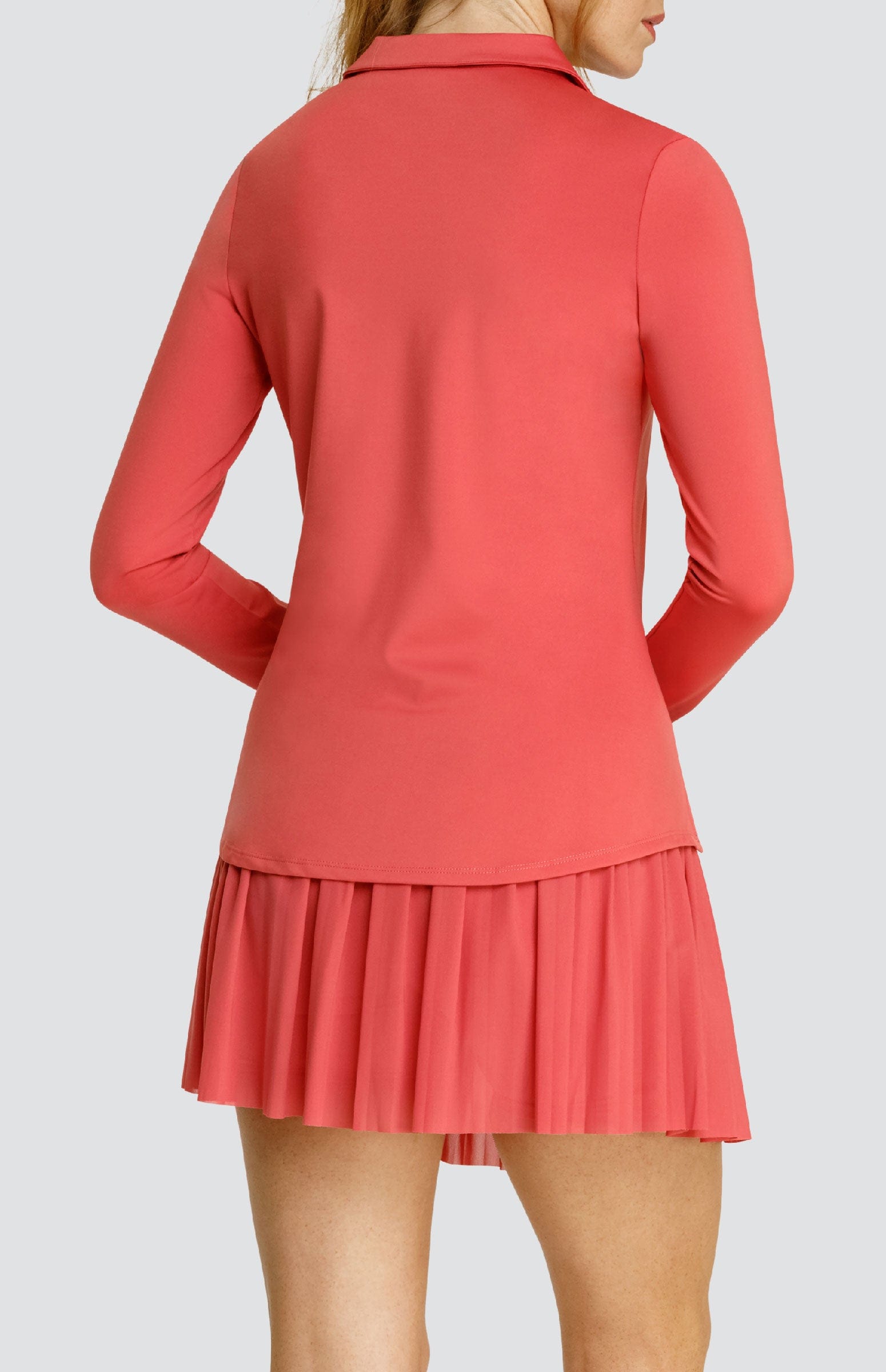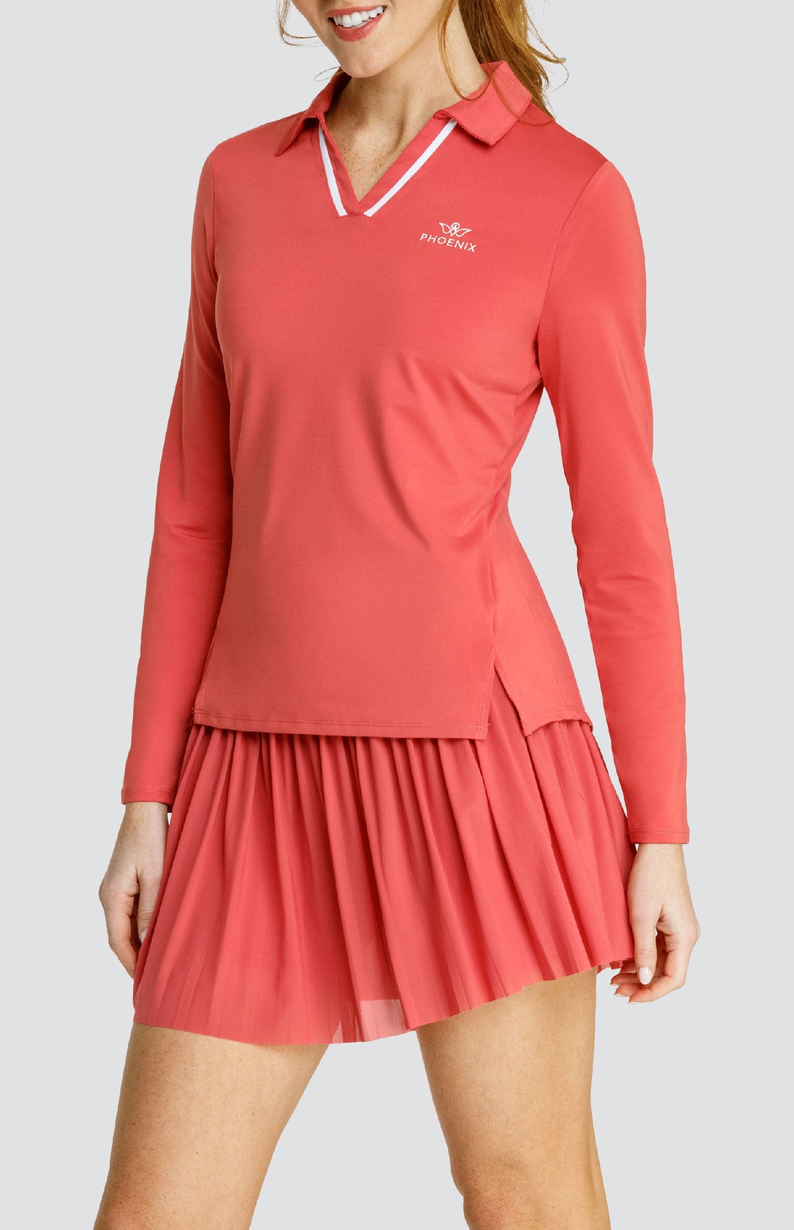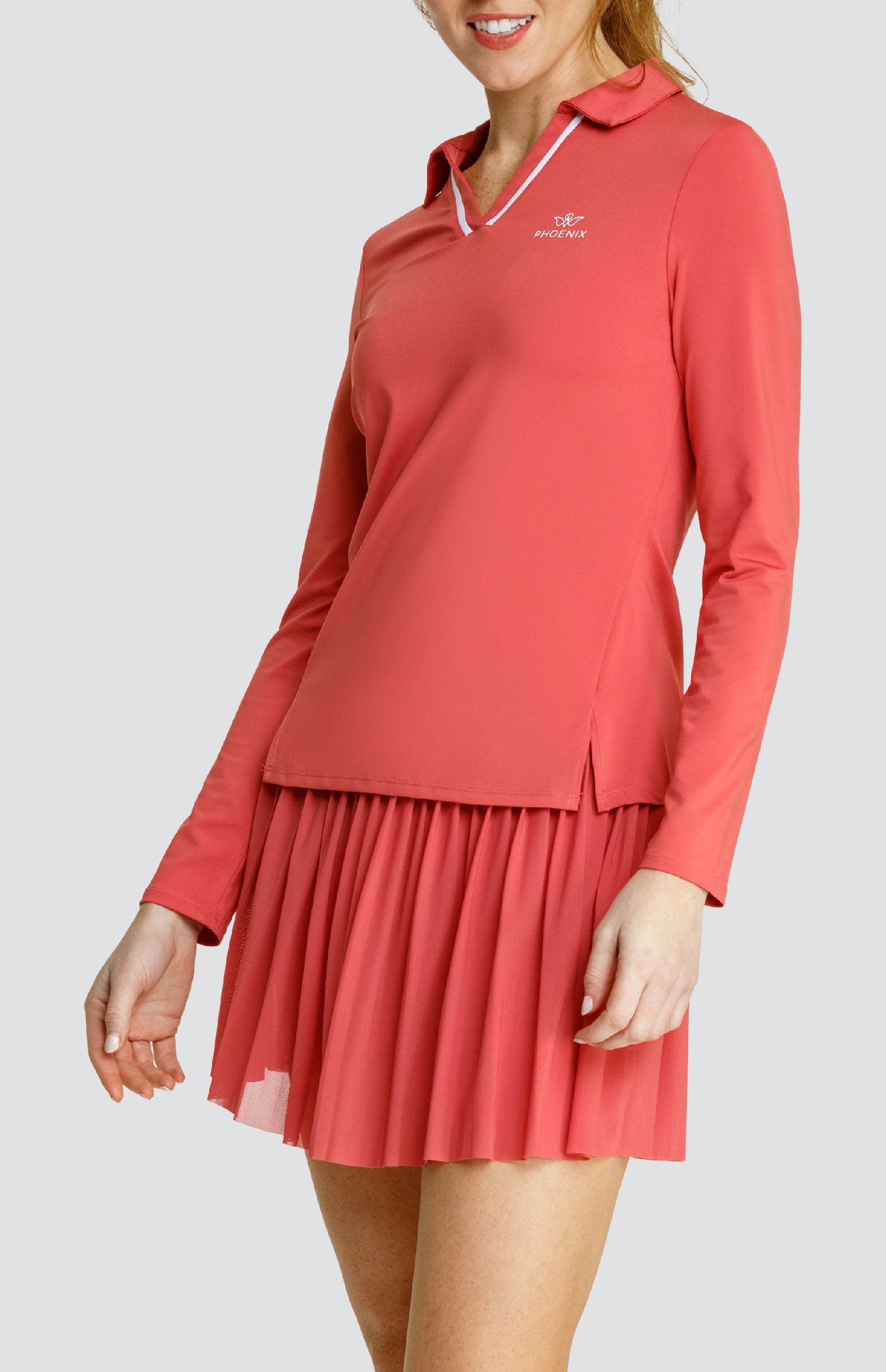 Feel great in the sophisticated style of the Saturday long sleeve top, featuring an open Johnny foldover collar, elegant chalk piping accents, a high-low hemline, and vents on shifted side seams. Made with our wrinkle-resistant, moisture-wicking Impact Jersey fabric, it will continue to be a staple in your wardrobe wash after wash. And the UPF 50+ protective technology that is built-in to the fabric will give you peace of mind as you play under the sun’s harmful rays.